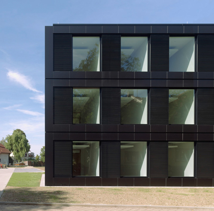 die dunkle metallfassade des erweiterungsbaus steht in spannungsreichem kontrast zur sandsteinfassade des altbaus. die struktur der büroräume ist in der fassade ablesbar. jalousien und öffnungsflügel, die auch der nachtauskühlung dienen, sind in die fassadenelemente integriert.